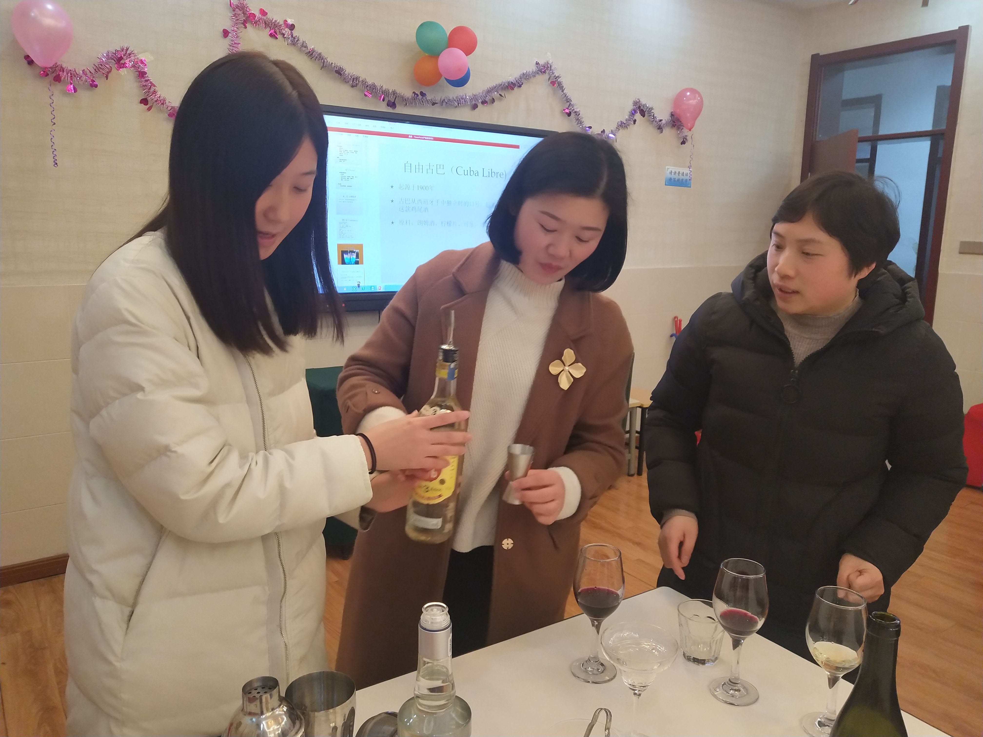 座谈会结束后,大家移步调酒实训室一边学习如何调酒一边面对面地交流心得,女同胞们欢声笑语,沉浸在幸福喜悦的节日氛围中。