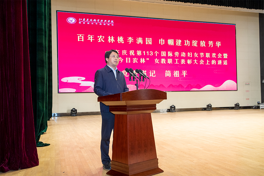 党委书记简祖平向全体女教职工送上节日祝福,并以“百年农林桃李满园,巾帼建功绽放芳华” 为题发表了热情洋溢的讲话。他指出,“百年农林风华茂,巾帼建功谱新篇” ,各位女教职工们对初心的坚定传承,让百年农林赓续血脉,践行使命;对事业的全心投入,让百年农林阔步前行,风华正茂;对生活的无比热爱,让百年农林收获感动,凝聚力量。在“两个一百年”的历史交汇点上,在百年农林的关键节点上,学院总结过去、砥砺前行、赢得未来的大格局和大战略,是我们努力创建职业本科院校的“新征程”,也是我们正在努力建设中国农业职业教育领军学校的“农林梦”。在这场百年农林的接续奋斗中,你们必将绽放出独属于农林巾帼的绚烂荣光。