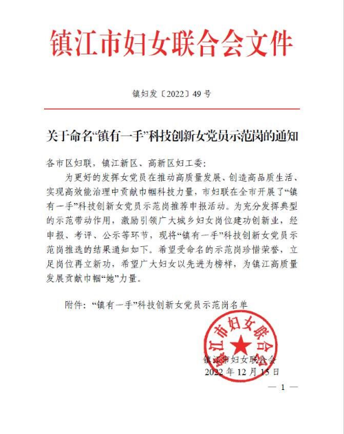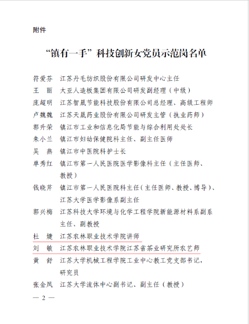 为更好地发挥女党员在推动高质量发展、创造高品质生活、实现高效能治理中贡献巾帼科技力量,充分发挥典型的示范带动作用,激励引领广大城乡妇女岗位建功创新业,镇江市妇联在全市开展了“镇有一手”科技创新女党员示范岗推荐申报活动,经申报、考评、公示等环节,茶与食品科技学院刘敏和畜牧兽医学院杜婕获评“镇有一手”科技创新女党员示范岗。