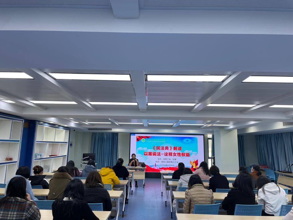 3月7日下午,学院工会、妇联在信工学院一楼大学生活动中心举办《民法典》解读—诠释女性权益讲座,学院妇联执委会委员、教职工代表参加了此次活动。