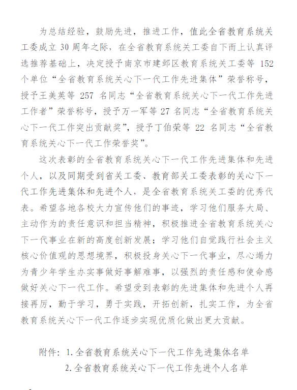 我校一贯注重关心下一代工作。近年来,在省教育系统关工委的指导下,在学校党委、行政的领导和支持下,学校关工委创新工作思路、加大工作力度、找准工作重点、服务工作对象,取得了新的成绩,在校园内外产生了良好的反响,得到了社会各界的广泛赞誉。