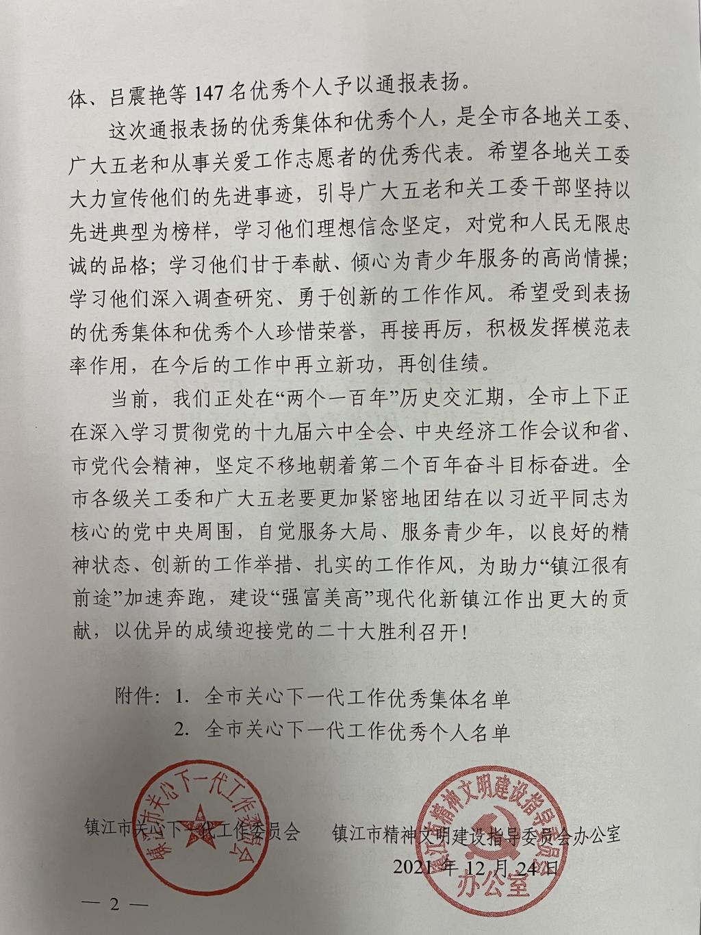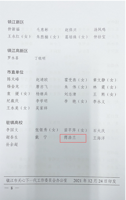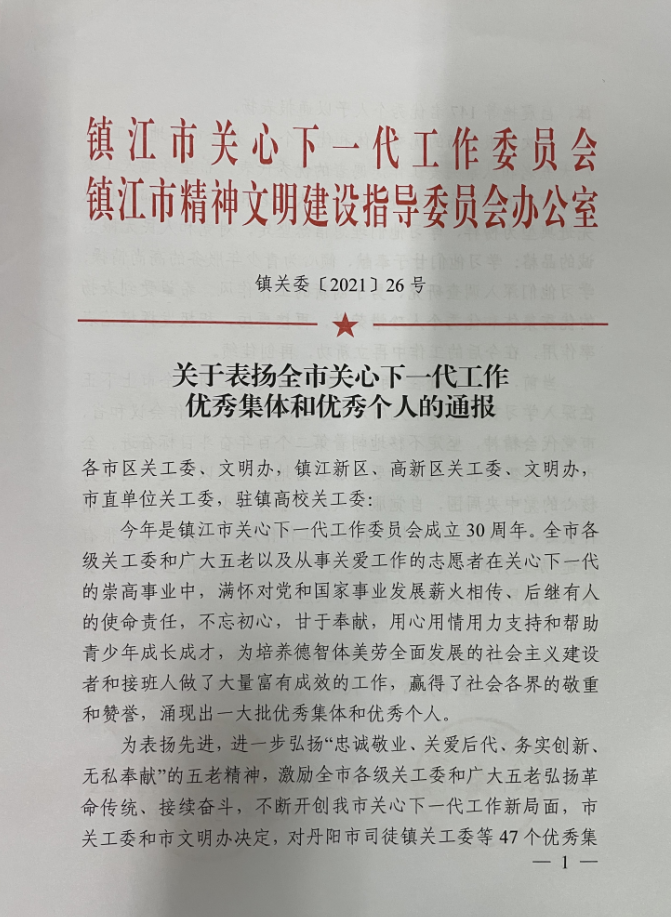 12月24日,在镇江市关心下一代工作委员会成立30周年纪念会议上,我校关工委荣获“优秀集体”称号,傅浩兰被评为“优秀个人”。