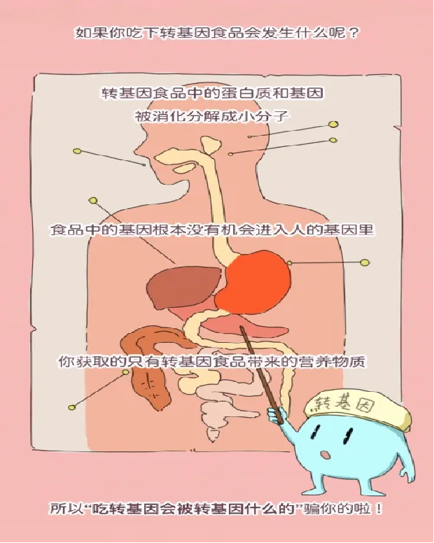 转基因技术安不安全?转基因食品能不能吃?国家批准上市的转基因产品都是安全的。不论是转基因食品还是非转基因食品,都含有基因。基因进入人体后,会在消化系统的作用下分解成小分子,不再以基因的形态存在,也不再具备原来的功能。其次,基因要想转入到另一种生物体内,需要一定的转化方法,而人体内部并不存在这种转化方法。