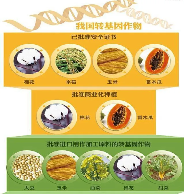 我国目前推广的转基因作物有哪些?目前我们国家批准种植的转基因农作物有两种:一种是转基因棉花,一种是转基因木瓜。我们在市场上买到的木瓜,绝大多数都是转基因的。转基因棉花虽然不能吃,但是转基因棉花的籽可以榨成棉籽油,这个是可以吃的。我国从国外进口的转基因产品主要是大豆和玉米。这两种转基因产品只能用作加工原料,不能直接卖给消费者。所以在超市里见到的转基因大豆、玉米,都已被加工成大豆油、玉米油、膨化食品之类的商品了。