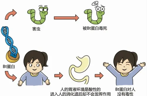 Bt基因来源于苏云金杆菌,它是一类非常重要的病原性细菌,广泛分布在世界各地。苏云金杆菌在芽孢形成过程中产生蛋白质,并以结晶方式出现,这些蛋白质具有特异性的杀虫活性。Bt蛋白在伴孢晶体内是以原毒素的形式存在,此时无活性。当被鳞翅目昆虫摄食之后,这些蛋白质会与昆虫中肠上皮细胞特异性受体结合,引起肠道穿孔,致使昆虫幼虫停止进食而最终死亡。目前Bt制剂在农业中作为常规杀虫剂使用,并且对人是安全的。