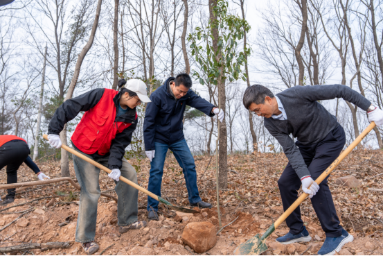 为全面贯彻党的二十大和二十届二中、三中全会精神,习近平生态文明思想,充分发挥战斗堡垒作用、持续擦亮“先锋‘树’人”党建品牌底色,在第47个植树节到来之际,风景园林学院组织党员师生、青年团员走进句容市磨盘山林场开展“党旗飘扬林海间,校企携手培新绿”义务植树主题活动,将红色信仰与绿色使命深度融合,以实际行动践行“绿水青山就是金山银山”的生态理念。