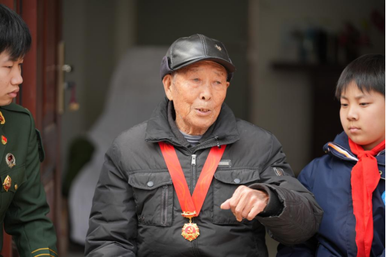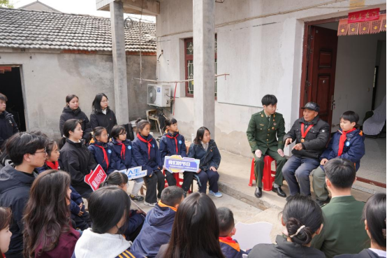 随后,大学生带领小学生前往抗美援朝老兵王光孝爷爷家中。孩子们围坐一圈,听王爷爷讲述他在抗美援朝战争中的故事。王爷爷娓娓道来,带领孩子们抚今追昔。孩子们全神贯注听讲,被英雄的故事深深感动,眼中闪烁着泪花。讲述临近尾声之时,王爷爷更是带着现场学生一起唱起了“雄赳赳 气昂昂 跨过鸭绿江,保和平 卫祖国 就是保家乡……”。此刻,红色基因在跨越时空的追思与告慰中薪火相传、赓续不辍。